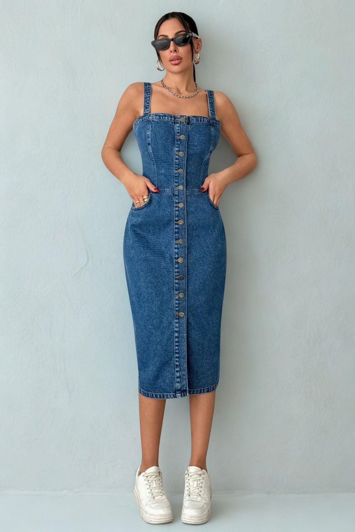 Kadın Düğmeli Midi Boy Kot Elbise (1187PLST)